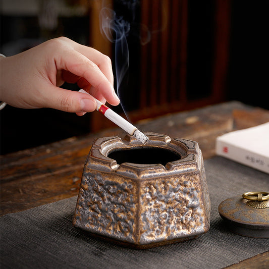 Creative Handmade Rough Pottery Tea Table Retro Simple Personality Household Ceramic Cigar Ashtray with Lid